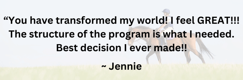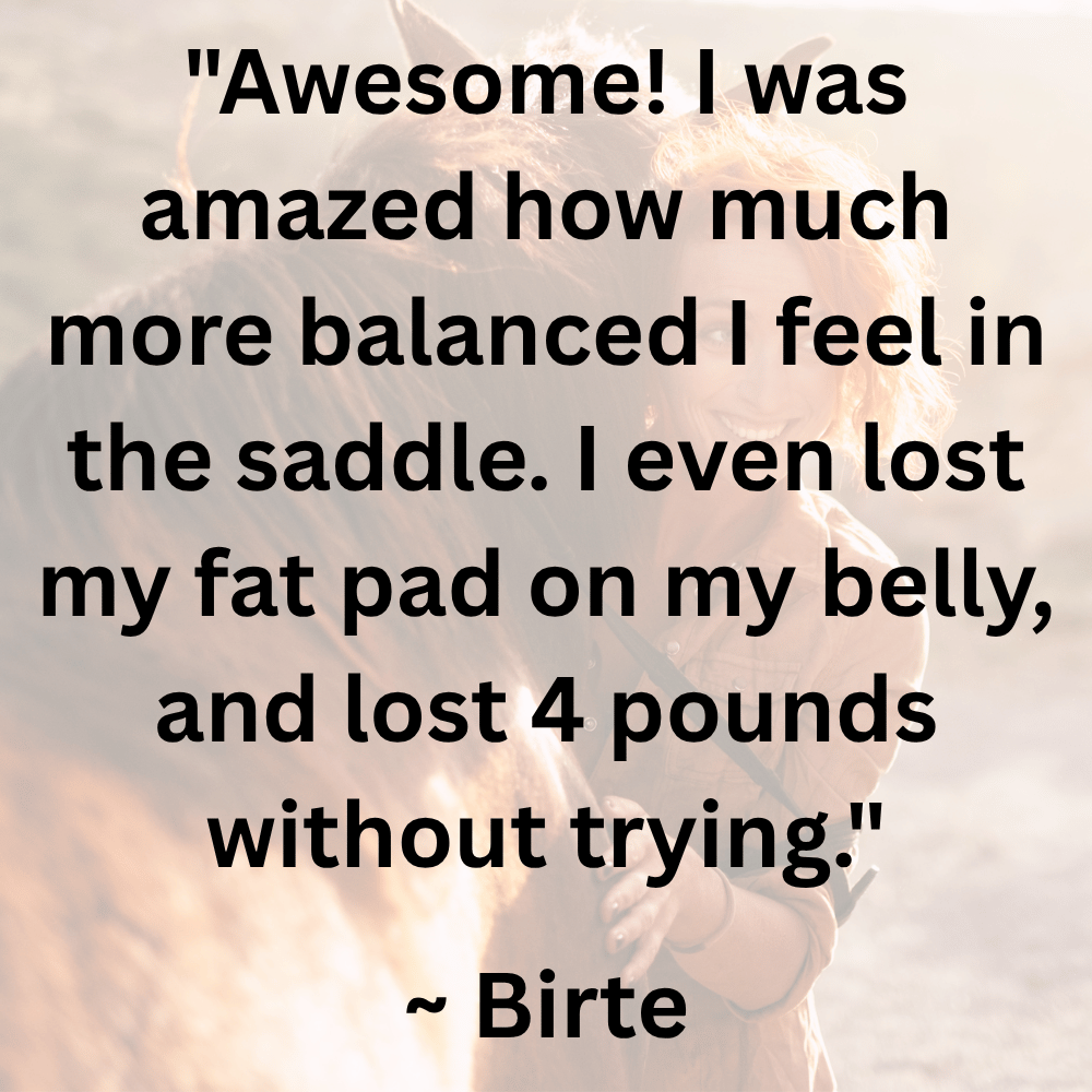 You’ll get access to the Leaner Stronger Rider program for as long as you remain a member. You’ll also get direct Q&A email access to me, monthly group coaching calls, a supportive crew of fellow horsewomen in our private Facebook community, group challenges for fun and motivation, plus my comprehensive Essential Equestrian Fitness program, and more.