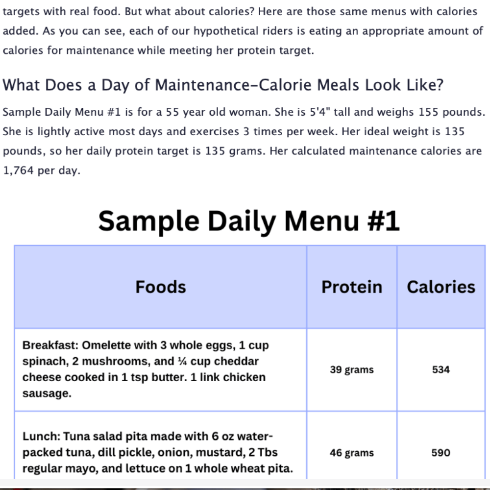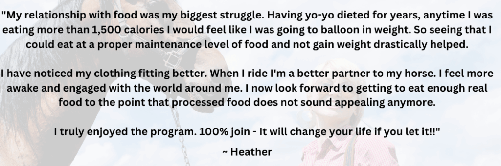 You can’t out-exercise the effects of a poor diet. We’ll implement The Sweaty Equestrian Food Rules as a foundation, then layer on more nuanced tactics to build muscle and lean out. Our methods are science-backed and realistic.