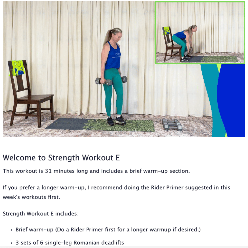 The program includes optional, rider-specific extended warm-ups and directions for how to include additional exercise if you wish.